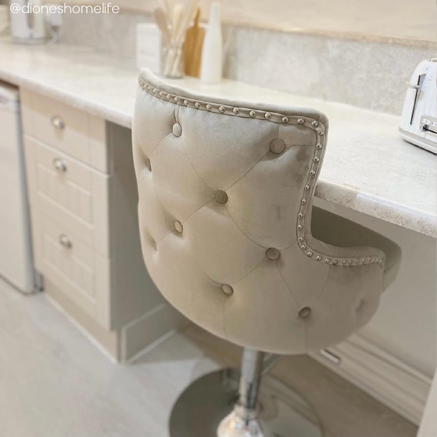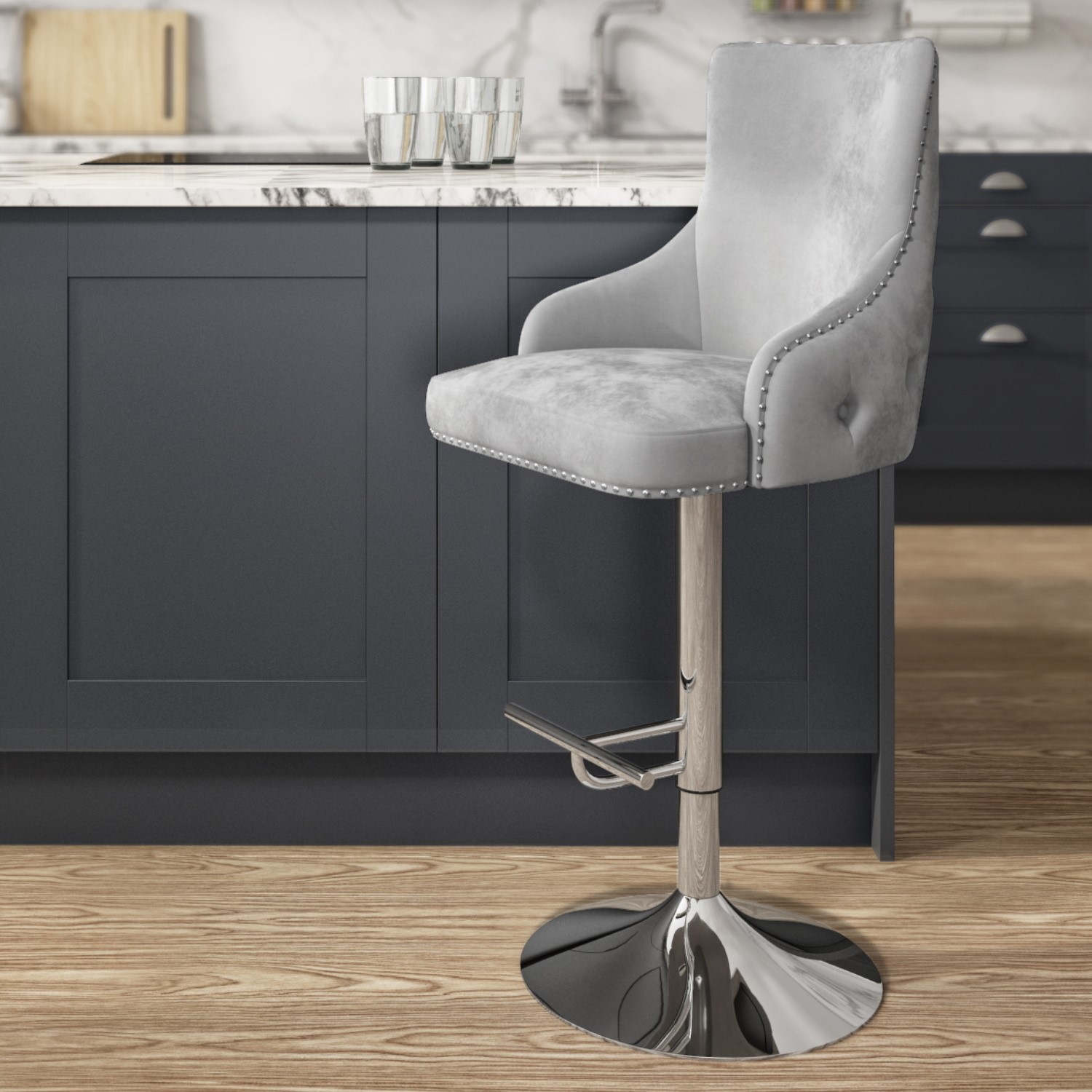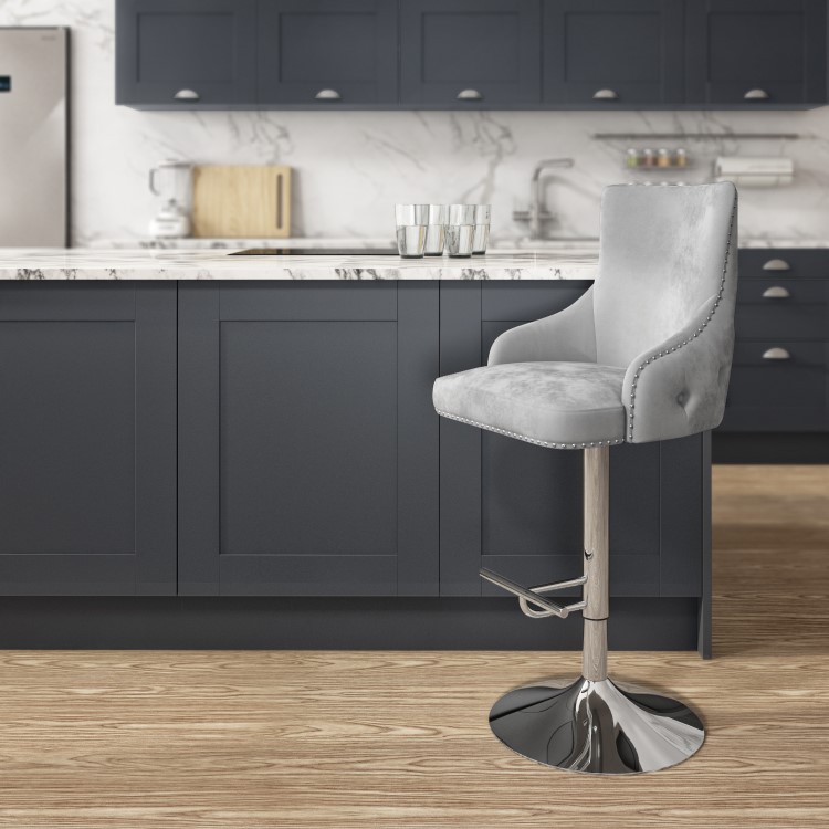 It’s easy to fall in love with the Jade Boutique silver-grey velvet bar stool. It can be adjusted between 64cm to 87cm, meaning it can be used at a multitude of heights - perfect for having your morning coffee or entertaining guests around your breakfast bar. Having friends’ round for cocktails? No problem, just adjust the stool to fit the height of your table. The opulent silver-grey velvet is accompanied by a chrome base and stud detailing. A full buttoned back offers not only comfort but a stylish feel.