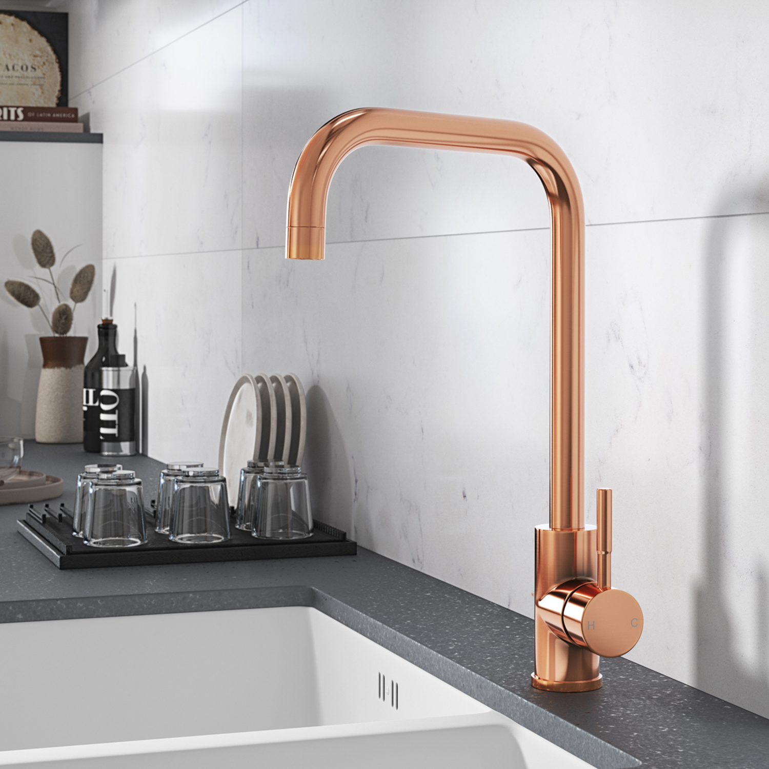 The Tamara kitchen tap brings timeless elegance to your space with its brushed copper finish and the squared neck design. Whether you're refreshing a classic kitchen or styling a modern setup, this tap delivers a luxurious look that complements any interior. The single lever offers effortless control over water flow and temperature, while the durable brass build ensures long-lasting performance.