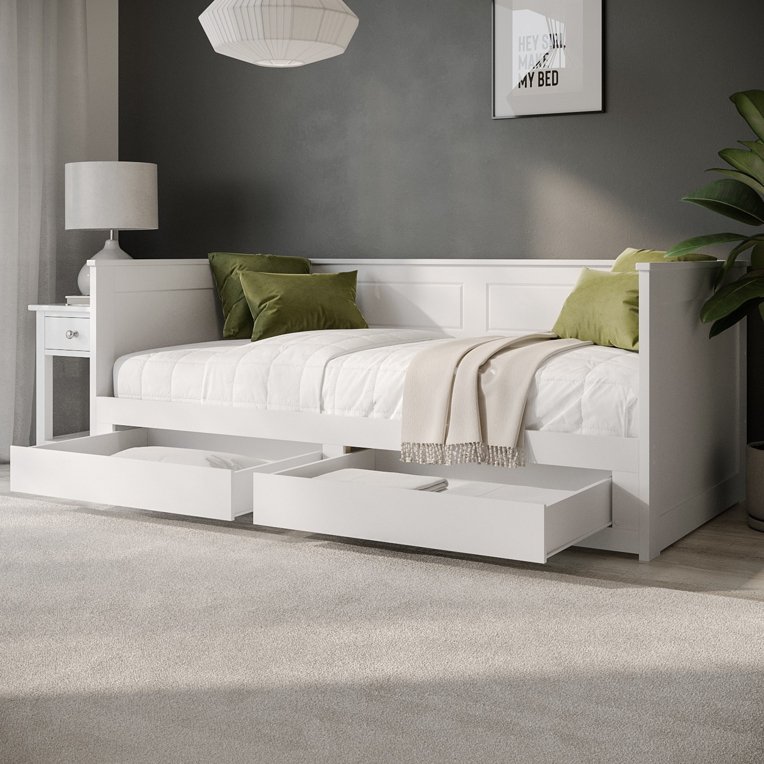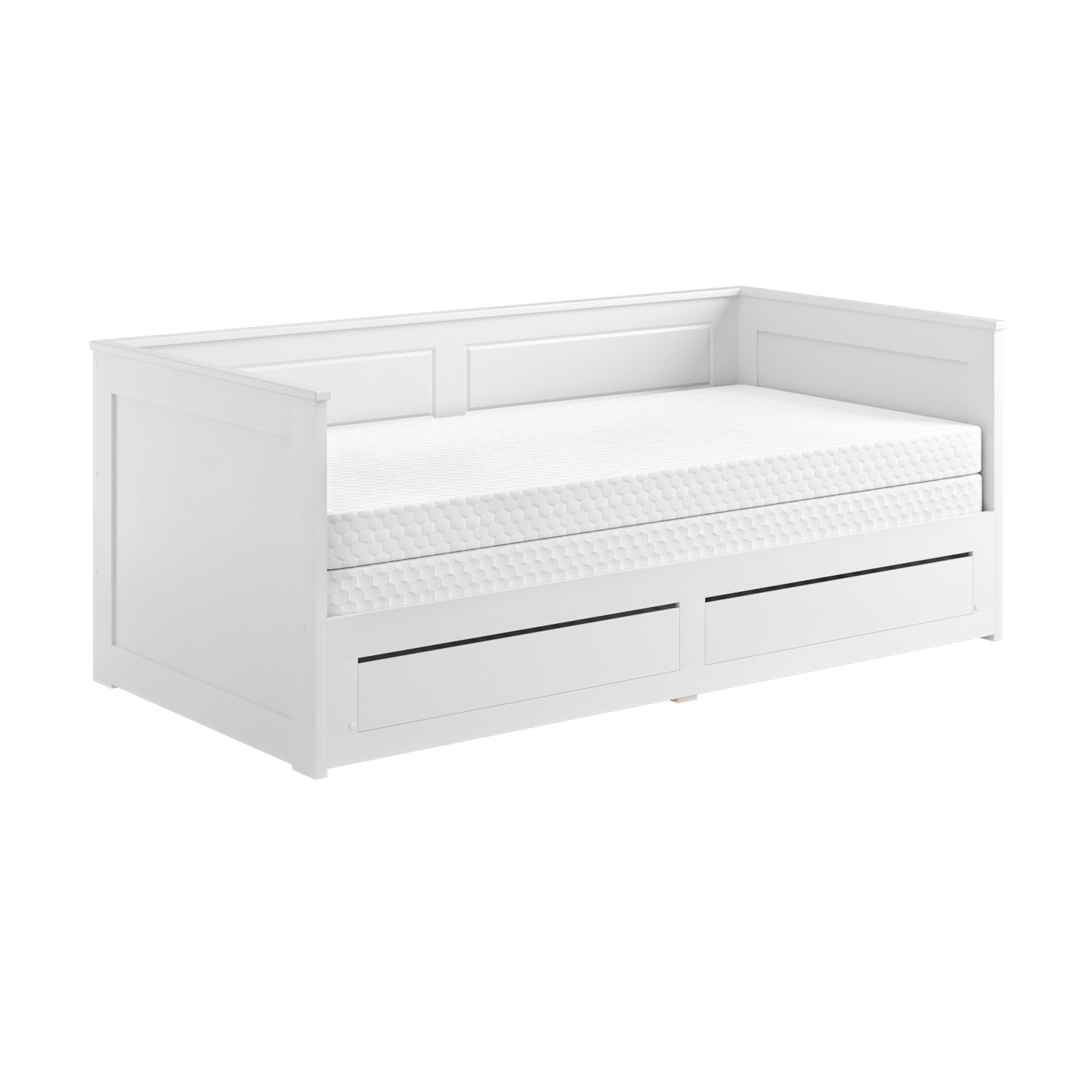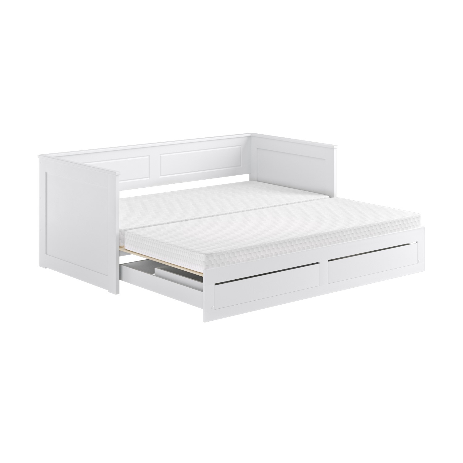Elevate your living space and add a touch of sophistication to your home with this beautifully designed daybed, blending style with functionality. Finished in a crisp white, its timeless design effortlessly complements both modern and traditional interiors. Use it as a modern sofa during the day and a spacious bed at night. It converts from a single to a double bed thanks to the easy-access trundle bed, which seamlessly fits within the bed frame. Once it's pulled out, it can accommodate multiple guests. Both beds have wooden slatted bases and fit two standard single mattresses that aren't included. We recommend pairing this bed with two VSLEEPFULMEM3FT Sleepful Single Memory Foam Mattresses for optimum comfort and a tidy fit.