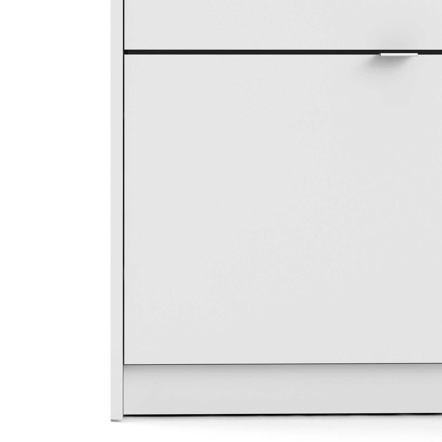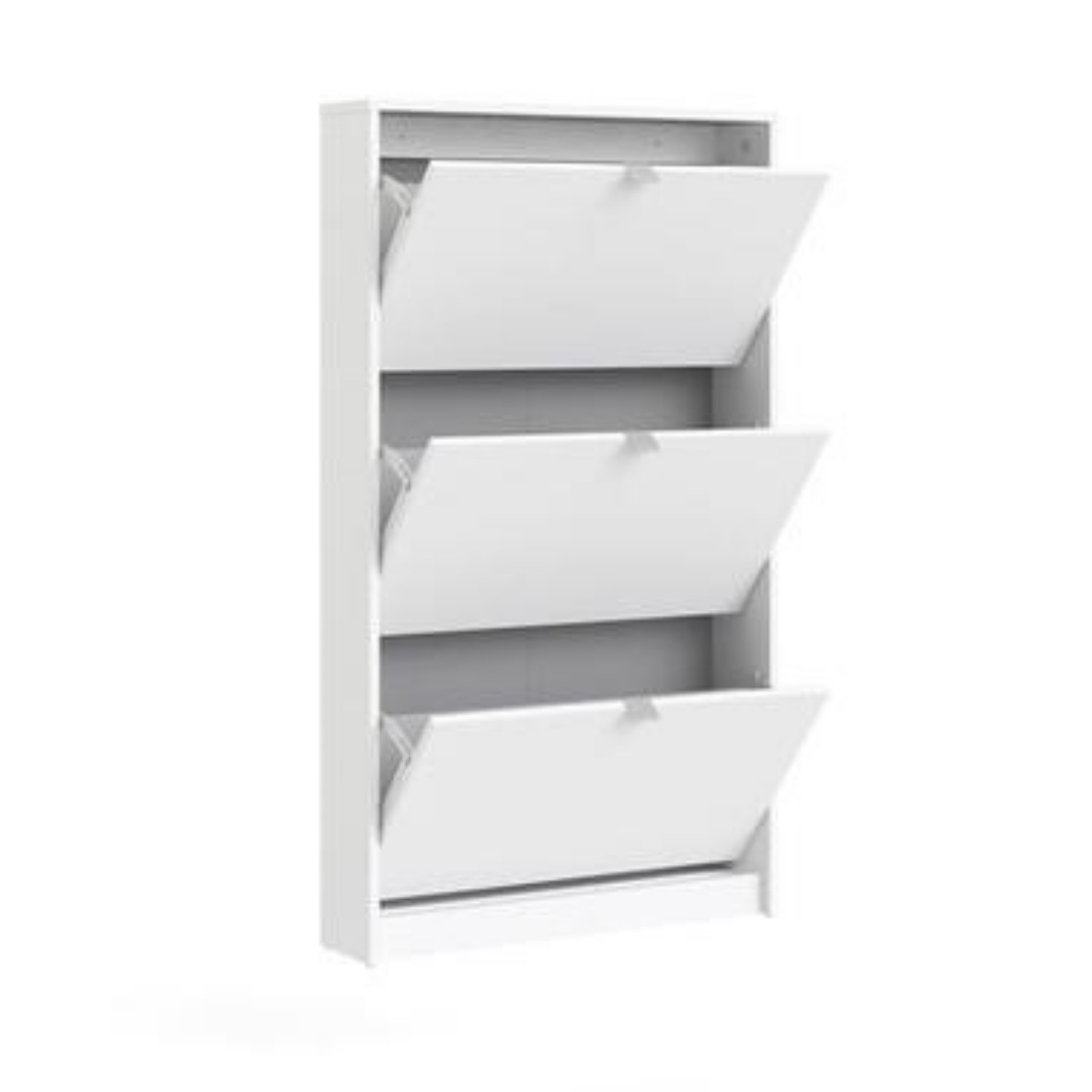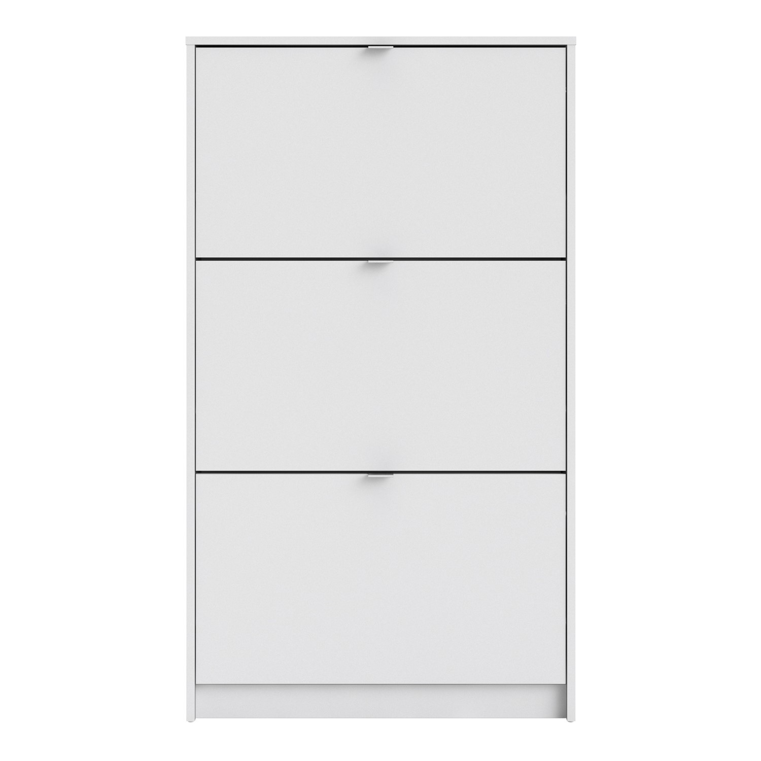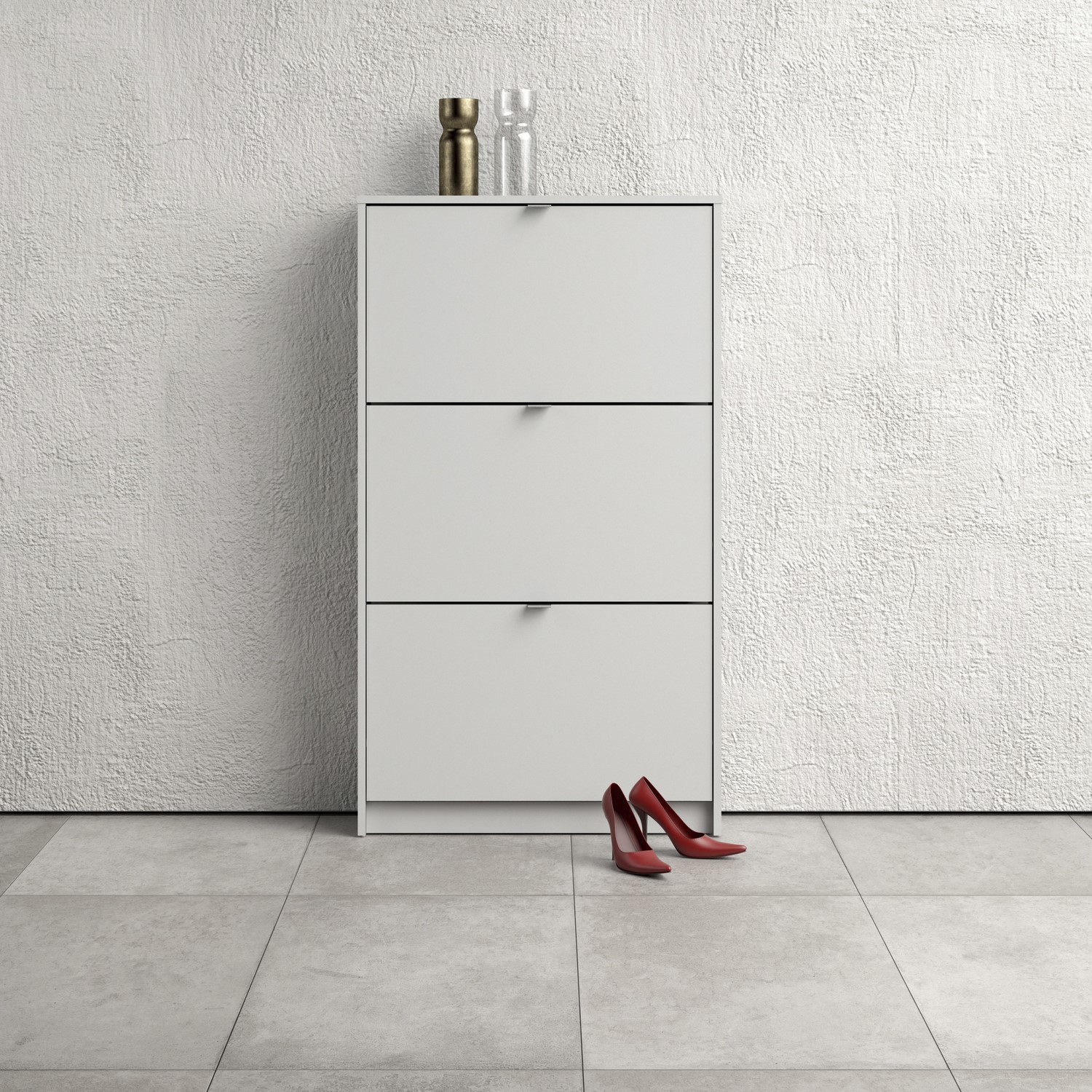 Keep your hallway free of shoes with this neat, slim shoe cabinet. Its sleek design has plenty of storage within its three spacious tilting compartments, each with a subtle metal handle, so you can keep your favourite pairs of shoes close to the door. It's easy to clean, too, thanks to its smooth laminate finish.