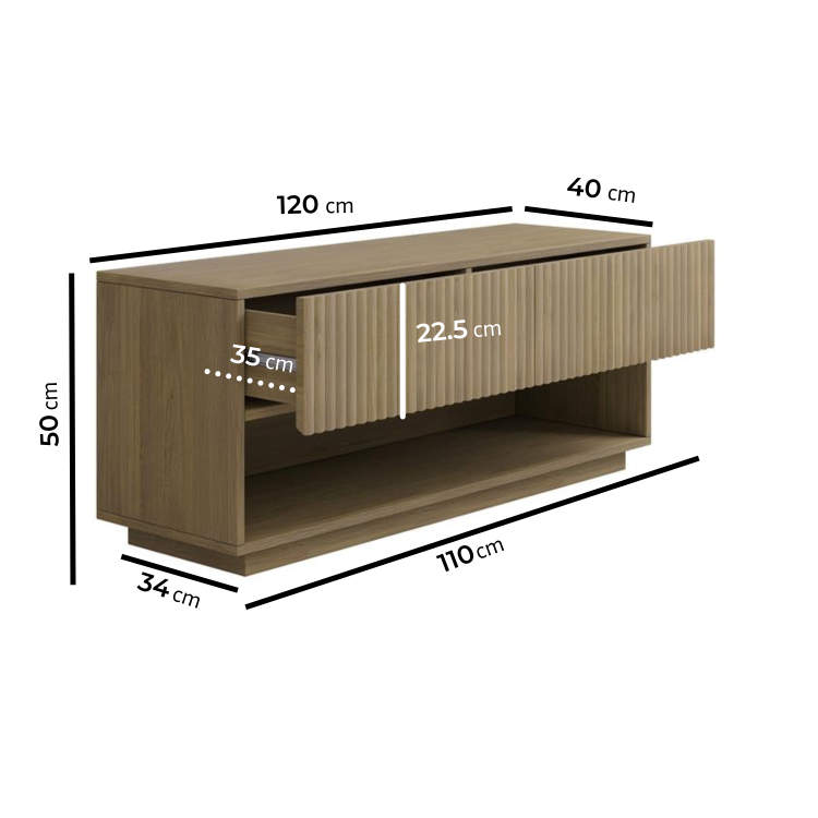 This contemporary freestanding TV unit combines clean lines with textured detailing to create a stylish focal point for your living room. The ribbed drawer fronts introduce subtle detail, while the natural oak-effect finish adds warmth and balance to the overall design. Built with everyday use in mind, the unit features two spacious drawers for storing remotes and other items, as well as an open shelf for media devices. A cable management cut-out helps maintain a tidy and organised TV setup.