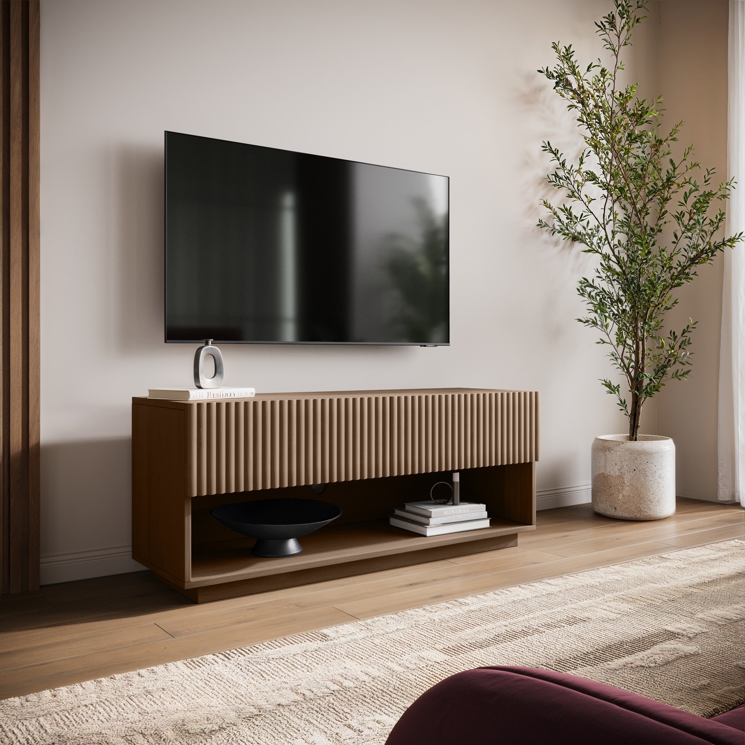 This contemporary freestanding TV unit combines clean lines with textured detailing to create a stylish focal point for your living room. The ribbed drawer fronts introduce subtle detail, while the natural walnut-effect finish adds warmth and balance to the overall design. Built with everyday use in mind, the unit features two spacious drawers for storing remotes and other items, as well as an open shelf for media devices. A cable management cut-out helps maintain a tidy and organised TV setup.