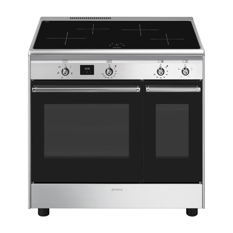 This 90cm cooker includes a large oven and a smaller auxiliary oven providing all the space you could ever need for your Christmas turkey and trimmings. The main oven features Smeg's Circulaire function, which provides many benefits including no flavour transfer when cooking different food types at the same time, and there are 5 cooking level positions to choose from within the cavity. The touch timer display and slider controls on the hob complete the design. Keeping the ovens clean is simple thanks to their easy clean enamelled interiors and also the Vapor Cleaning function on the main oven which helps lift off the dirt. The door glass of the main oven can be very simply removed in order to clean inbetween the layers to keep it looking smart. The hob top offers 4 powerful induction zone with booster option, so there is plenty of cooking space and hob options to cook with. This cooker has an EcoLogic option which, once selected, can limit the total power of the hob from a max of 7400W to 4500W or 3000W in order to save power.