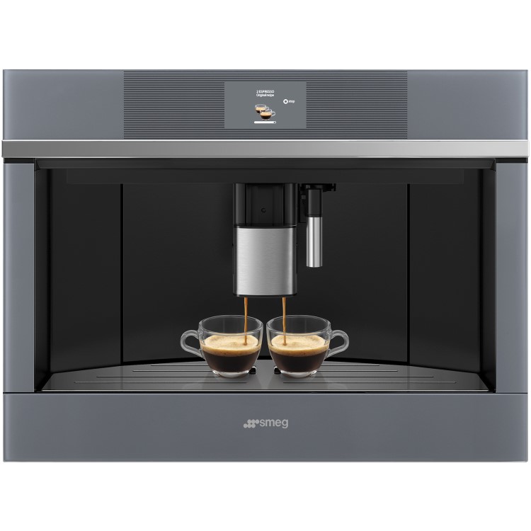 Smeg coffee machines offer the choice between coffee beans or ground coffee, to meet all tastes and needs. Cup warmer holders are positioned either side of the machine and the whole unit can be slid backwards into its housing using the telescopic guides.