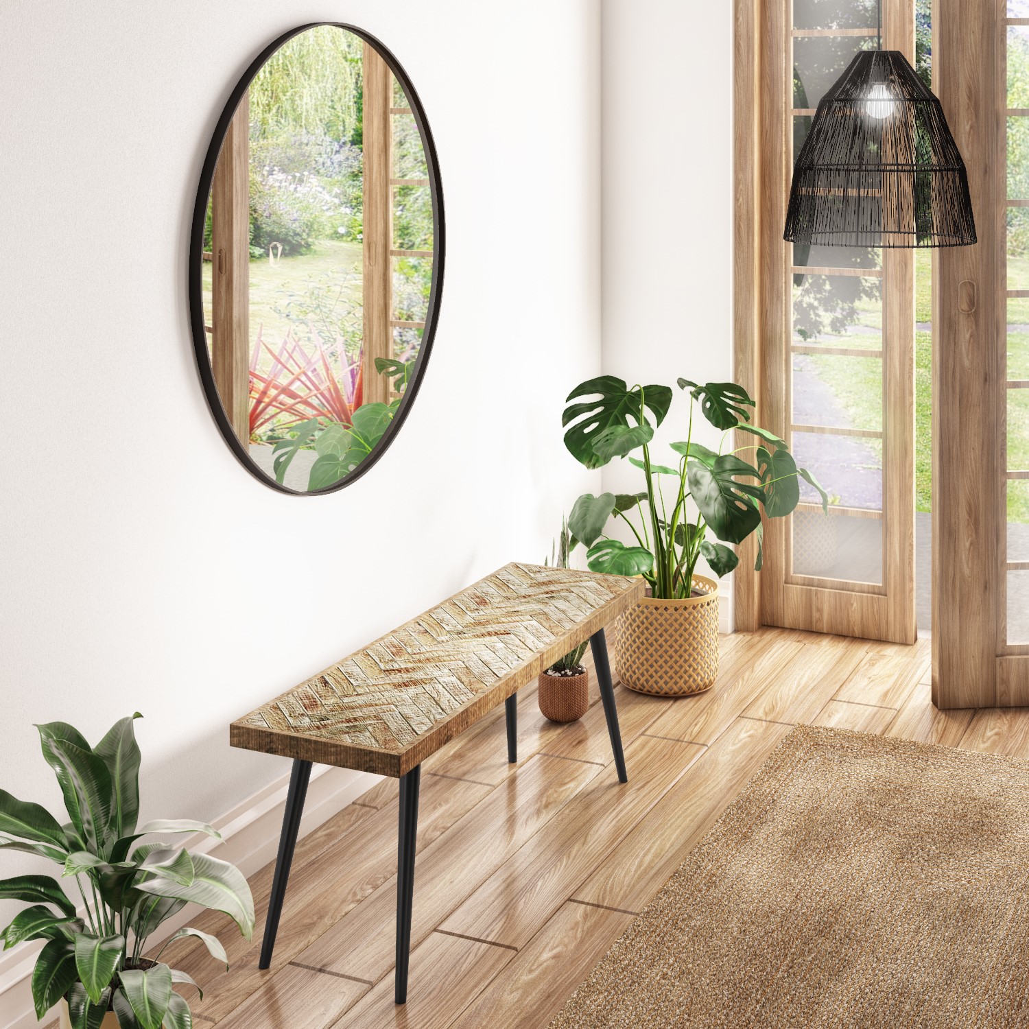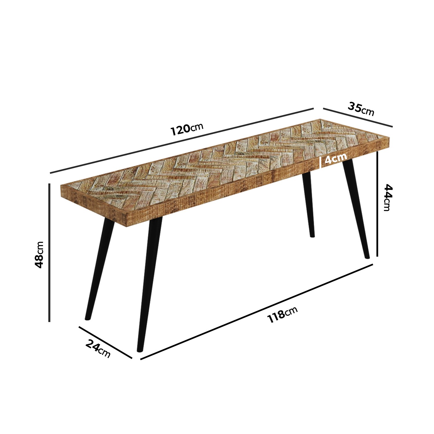 Be charmed by the delicate herringbone inlay work and industrial Arno hallway bench in recycled solid pine and black metal. It's sure to make a lasting impression as it takes centre stage in your hallway space.