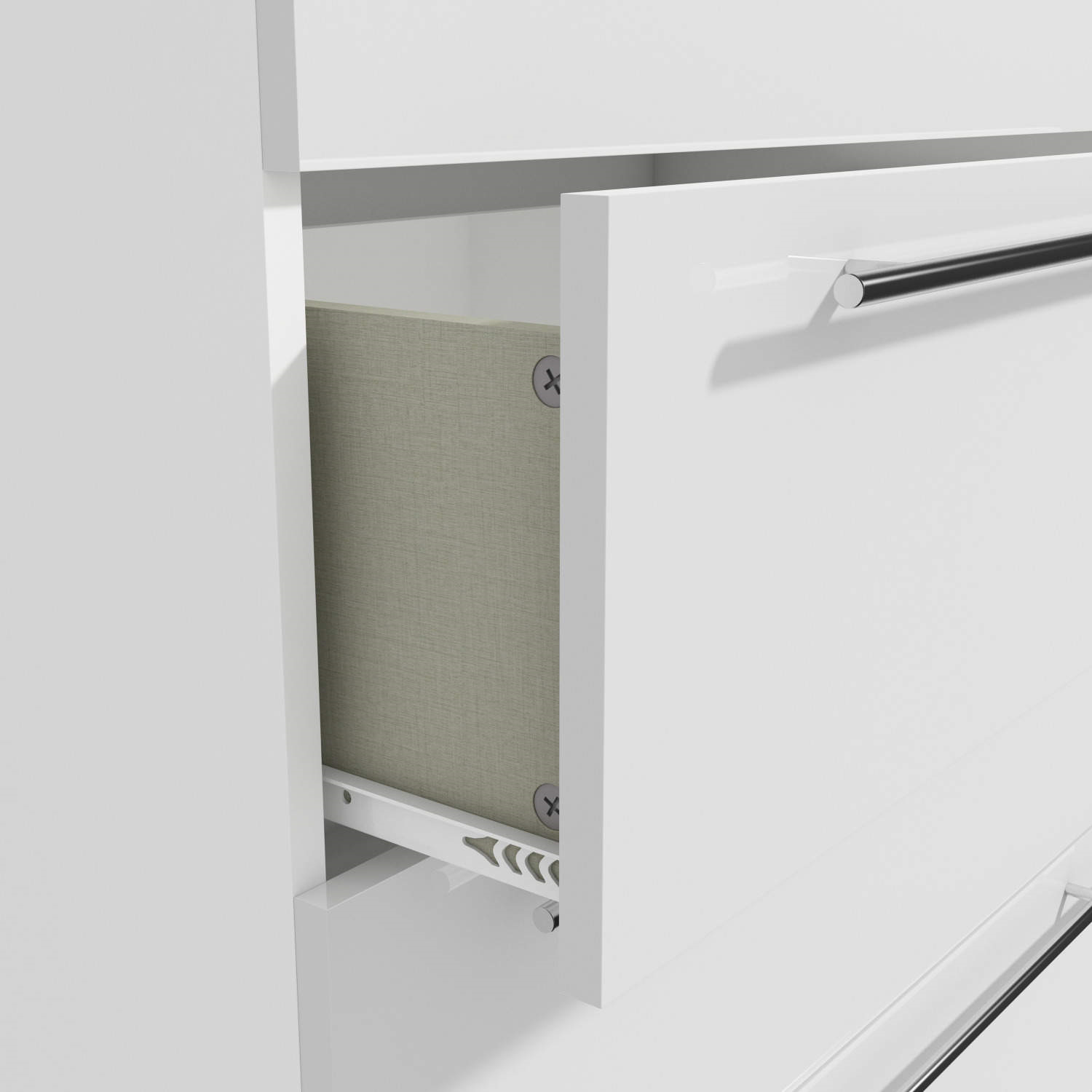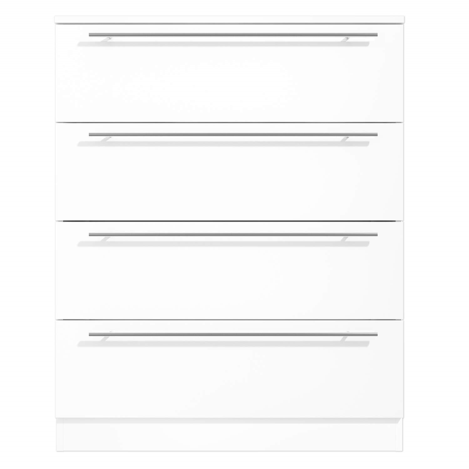 All the drawers have metal runners to ensure smooth openings and all the furniture has been finished with modern T-bar handles in premium stainless steel. The surface tops, drawer and door fronts have all been finished with a sleek white high gloss, they reflect light beautifully, giving them all their very own natural shine. The frames have been finished in a matt white, maintaining the fresh appearance of the set.