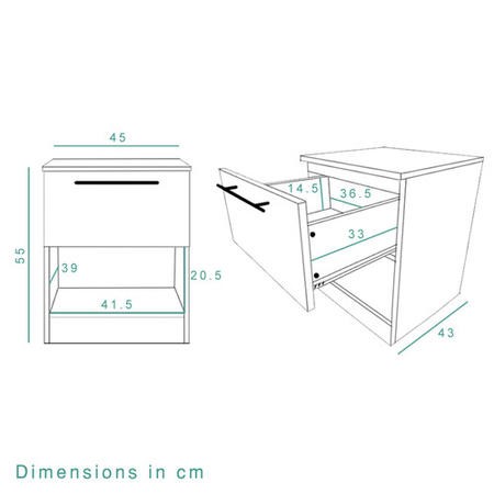 - Bedside drawer dimensions: H14.5 x W36.5 x D33 cm
