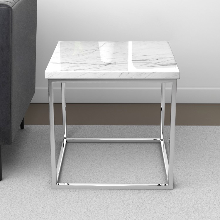 - Metal legs complement the white faux marble top
