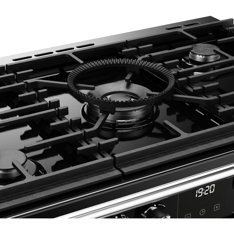 90cm Richmond Deluxe dual fuel range cooker with a 5 burner gas hob. Features include: cast iron pan supports, a 4kW PowerWok™ burner, conventional top oven & Maxi-Grill™ variable rate electric grill with telescopic sliders, 13 setting multifunction main oven with TrueTemp™ digital thermostat and rapid pre-heat. This model also includes the large capacity Titan™ twin fanned oven and the PROFLEX™ Splitter. Other features include the easy to read Maxi-Clock™ LED touch control programmer, Pro-Trac™ double-extension telescopic sliders, Steam & Infuse™ cooking accessory and cast iron griddle & wok cradle. All ovens are A rated for energy efficiency