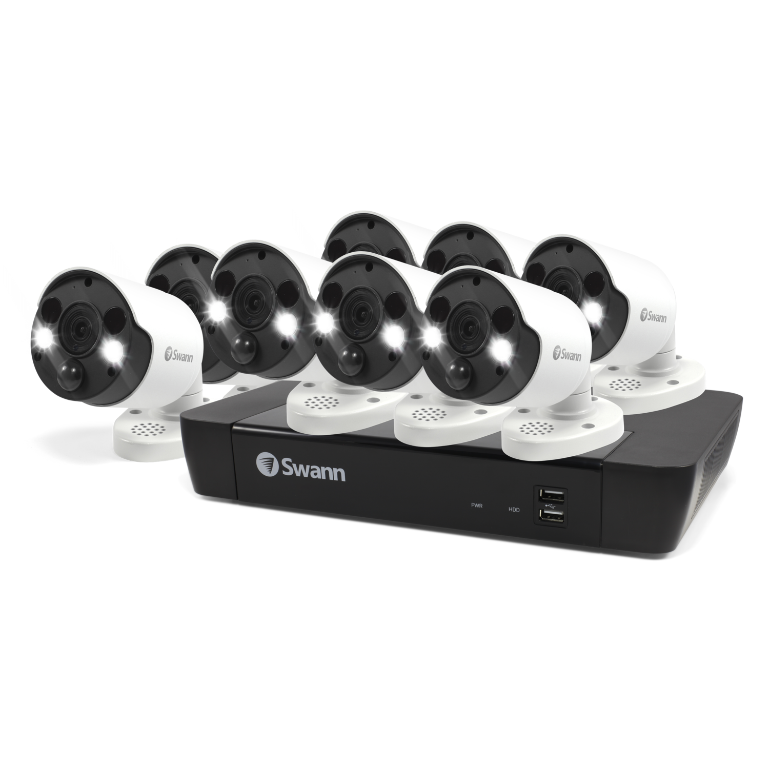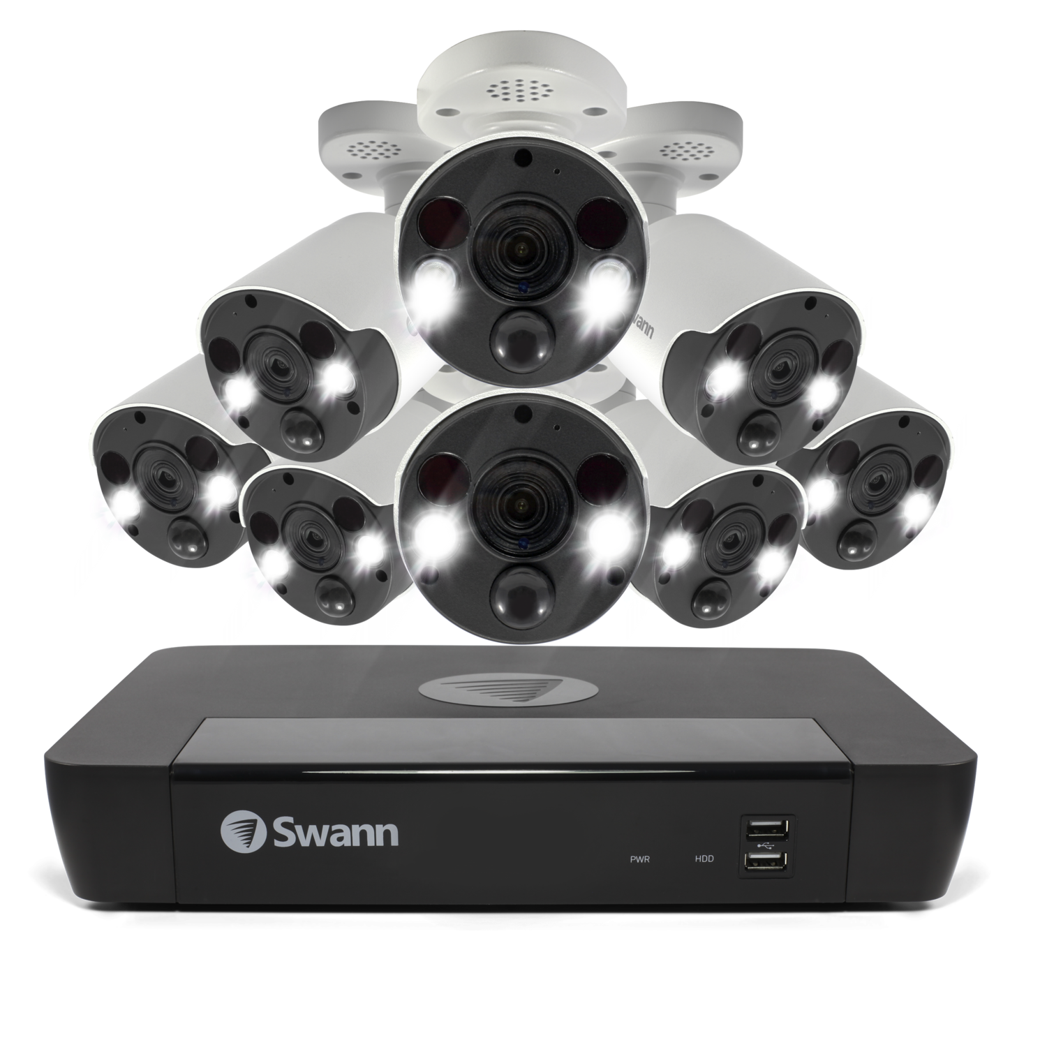 The 8 Sensor Spotlight Cameras turn the lights on & trigger recording when they detect heat. The 2-way audio & siren let you talk back & scare off intruders