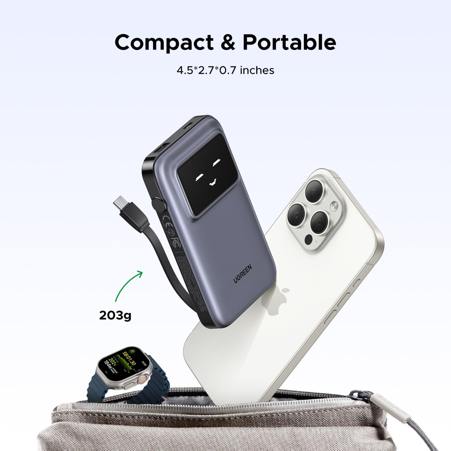 UGREEN 10000mAh phone charger power bank combines practicality and portability, powerful enough to fully charge iPhone 15 Pro up to 2 times or Galaxy S24 up to 1.7 times.