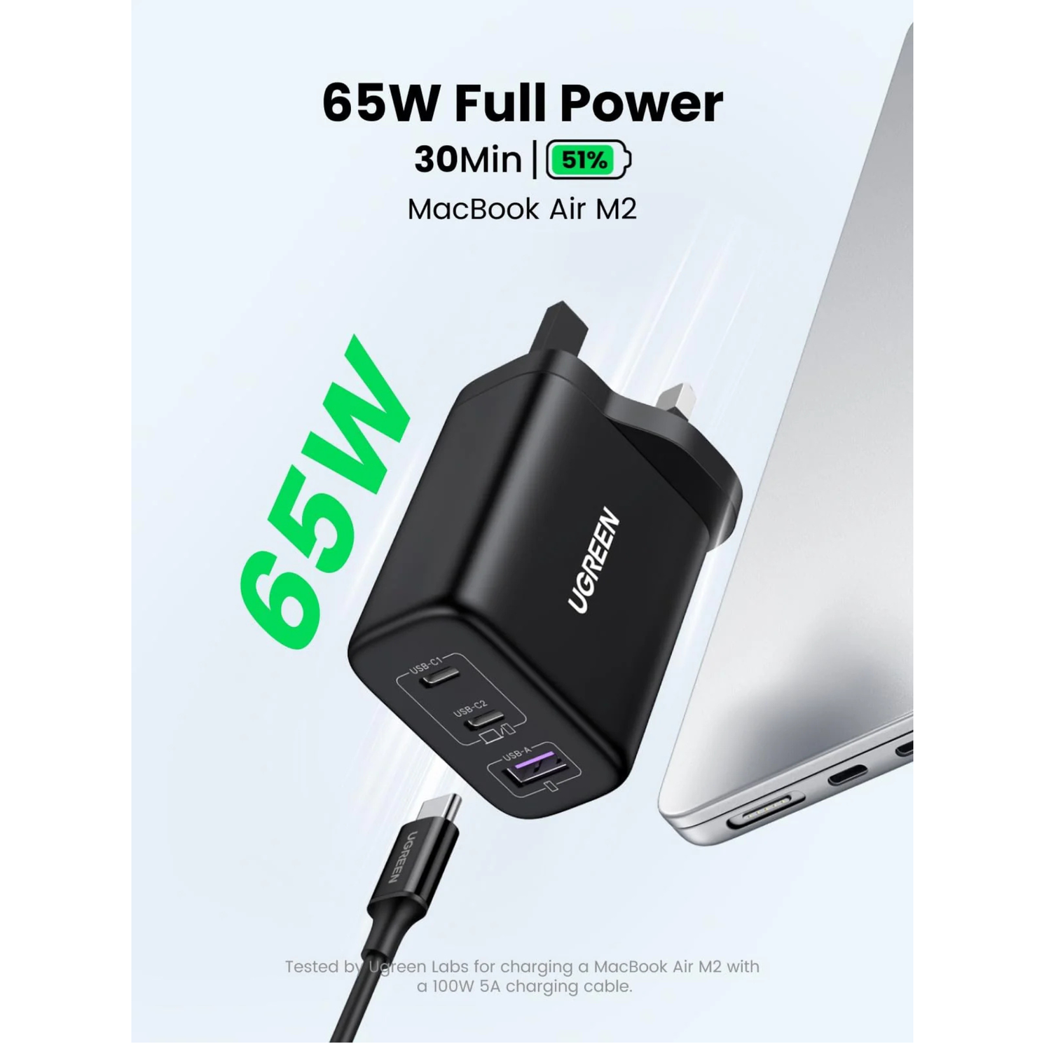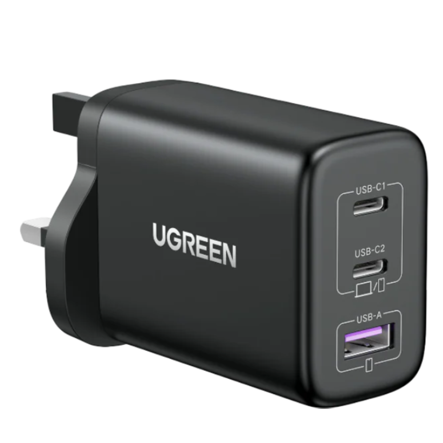 Equipped with two USB-C ports and one USB-A port, this charger powers up to three devices at the same time. Ideal for users with laptops, tablets, and smartphones.
