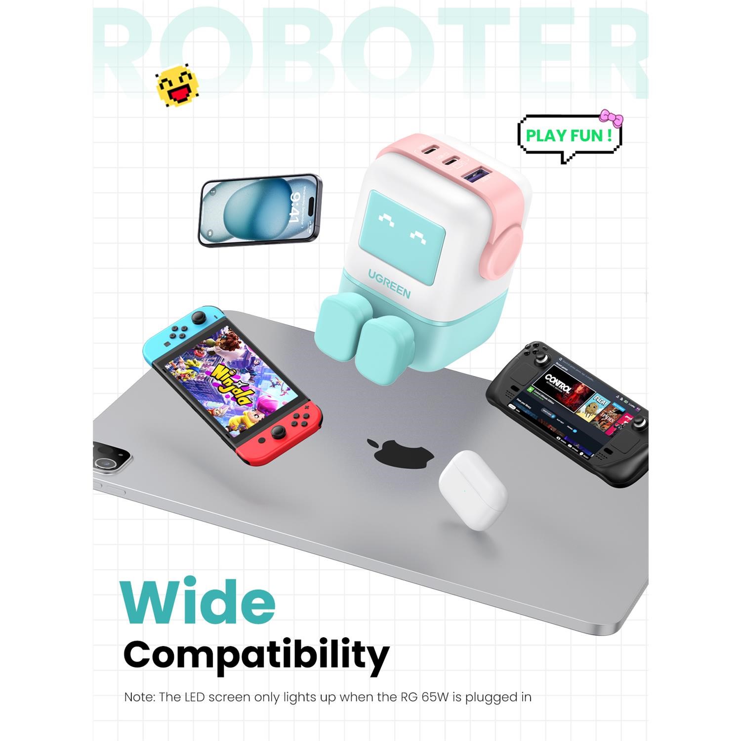 Introducing our futuristic and adorable UGREEN Uno 65W USB C GaN Charger, this UGREEN small robot-shaped charger combines functionality with fun, making it the ideal accessory for all your charging needs on the go.