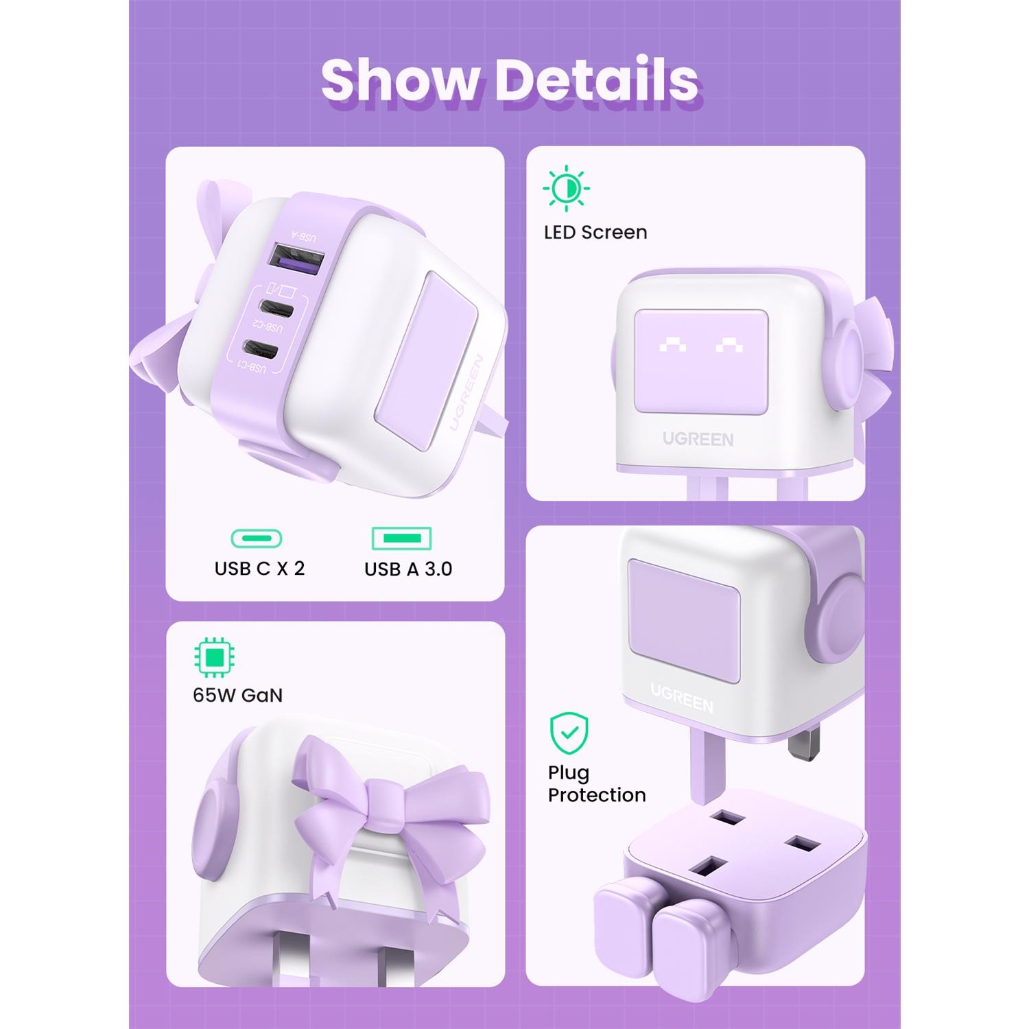 Introducing our futuristic and adorable UGREEN Uno 65W USB C GaN Charger, this UGREEN small robot-shaped charger combines functionality with fun, making it the ideal accessory for all your charging needs on the go.
