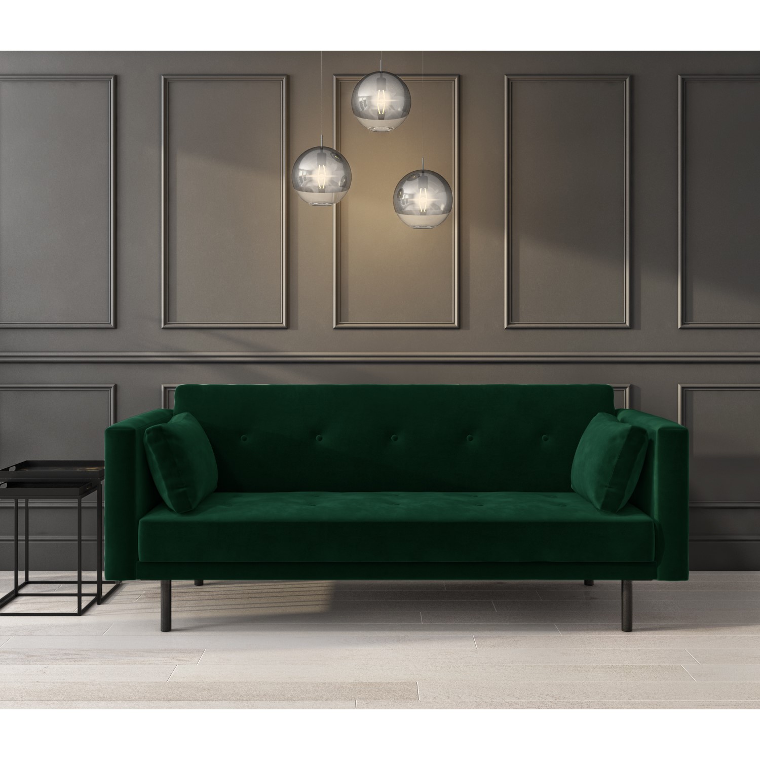 This Rory sofa bed is a striking combination of classic and contemporary styling. Beautifully upholstered in a soft touch green velvet fabric, it's guaranteed to make an impact, and it'll easily coordinate with other furnishings and décor. The dark metal legs add a final finishing touch. It comfortably seats two to three people, and when in bed mode it is a double that takes much less room than a spare bed; you'll always be ready for guests at a moment's notice. Plus, with two plump cushions; it's cosy as ever, sofa or bed.