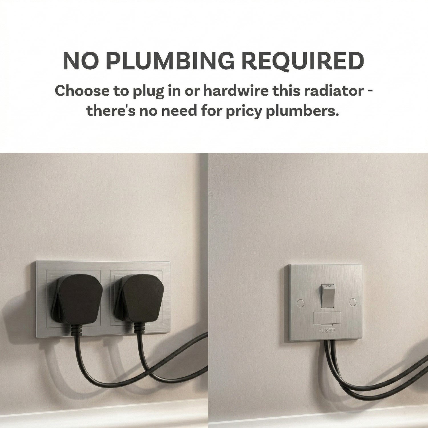 Hi,The radiator contains two heating elements, and while it comes with two plugs by default (one for each element), it can also be hardwired to the mains using a single cable if the elements are linked internally.Thanks!
