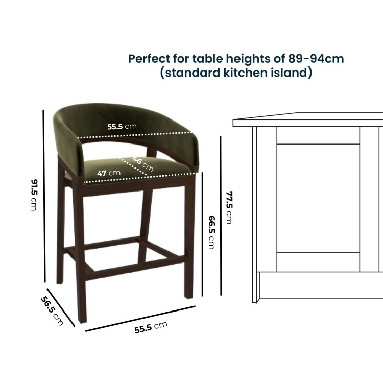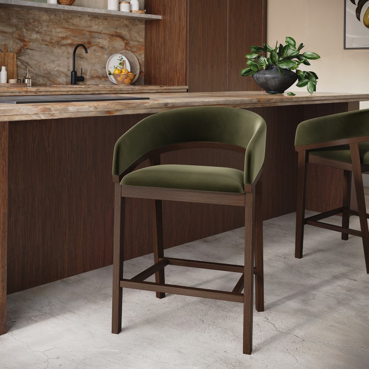Upgrade your kitchen space with this contemporary curved kitchen stool. Designed with a cut-out backrest and gently curved armrests, it blends modern sophistication with everyday comfort. The soft olive green fabric and plush padding create an inviting seat, whether you're enjoying a quick breakfast or entertaining guests. Supported by a sturdy solid wood frame in a warm walnut-stained finish, this stool not only offers a refined aesthetic but also delivers exceptional durability for daily use.