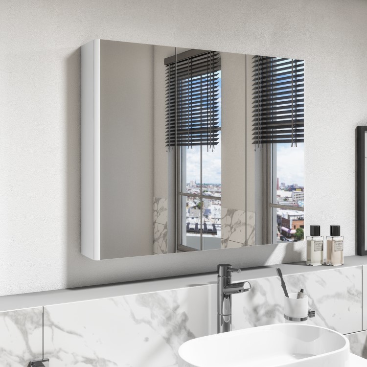 - Triple doors open to reveal two sections each with an internal shelf and two compartments to keep bathroom items close