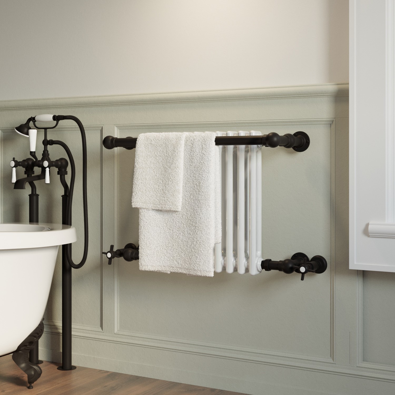 The Regent wall-mounted towel rail radiator is a sophisticated addition to any traditional bathroom. This towel rail features a sleek, built-in rail that provides a convenient and stylish way to hang your towels. Classically styled and designed for high heat output, this radiator efficiently warms your space from top to bottom, ensuring consistent comfort. Available in various colours, it adds a touch of elegance while enhancing your bathroom's classic style.