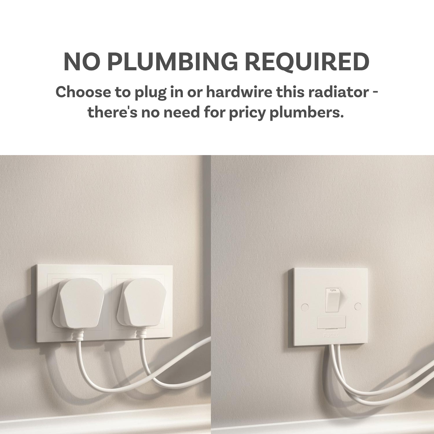 - Installation: 2 x 13 amp plugs (supplied) or single hardwired connection