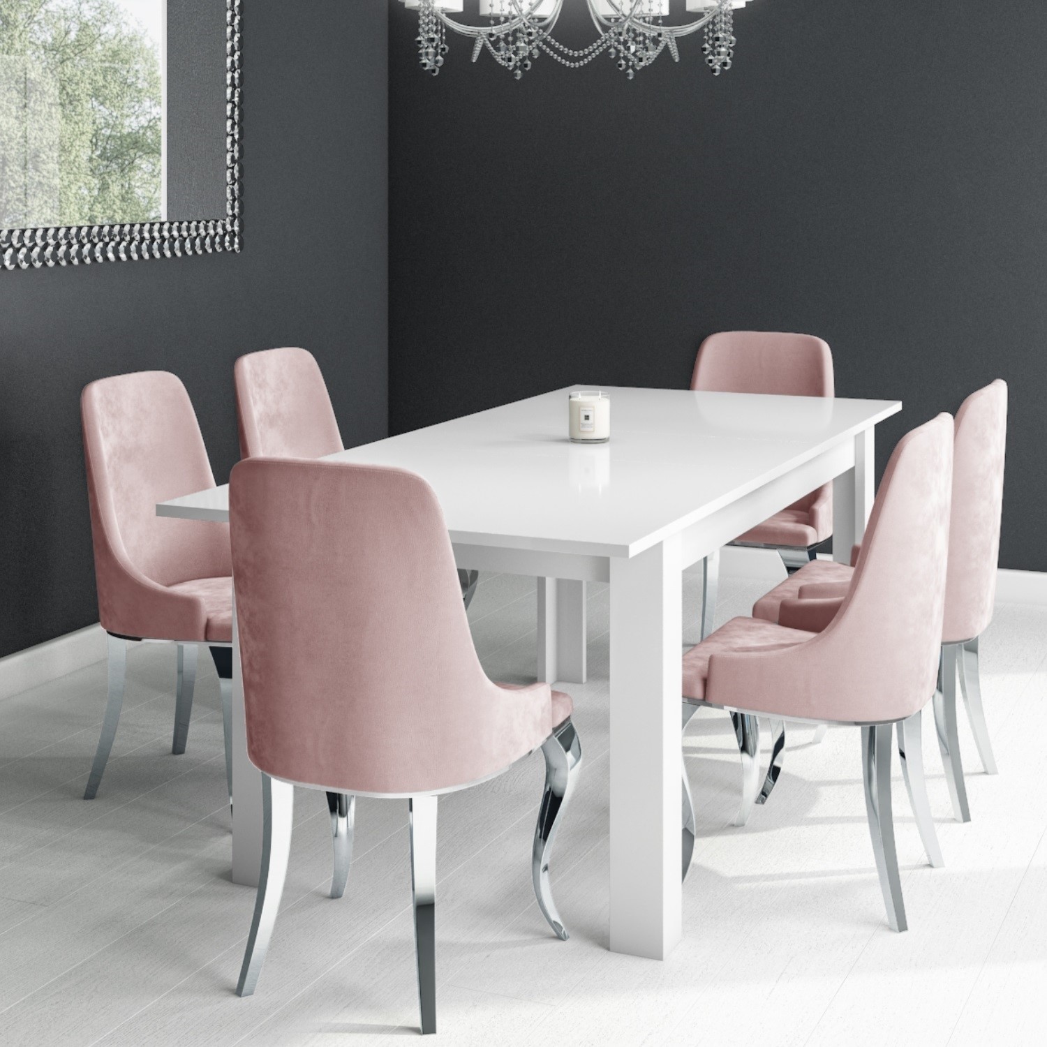 Completing the dining set are 6 Angelica dining chairs. With a wide, shapely seat and a supportive high backrest, and, upholstered in a beautiful pink velvet fabric and polished chrome stainless-steel legs; they offer a comfortable dining experience as well as being highly on-trend.