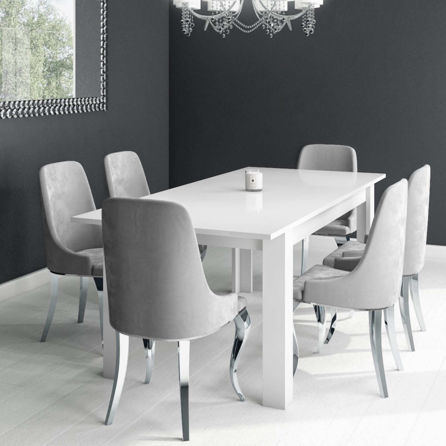 Completing the dining set are 6 Angelica dining chairs. With a wide, shapely seat and a supportive high backrest, and, upholstered in a beautiful grey velvet fabric and polished chrome stainless-steel legs; they offer a comfortable dining experience as well as being highly on-trend.
