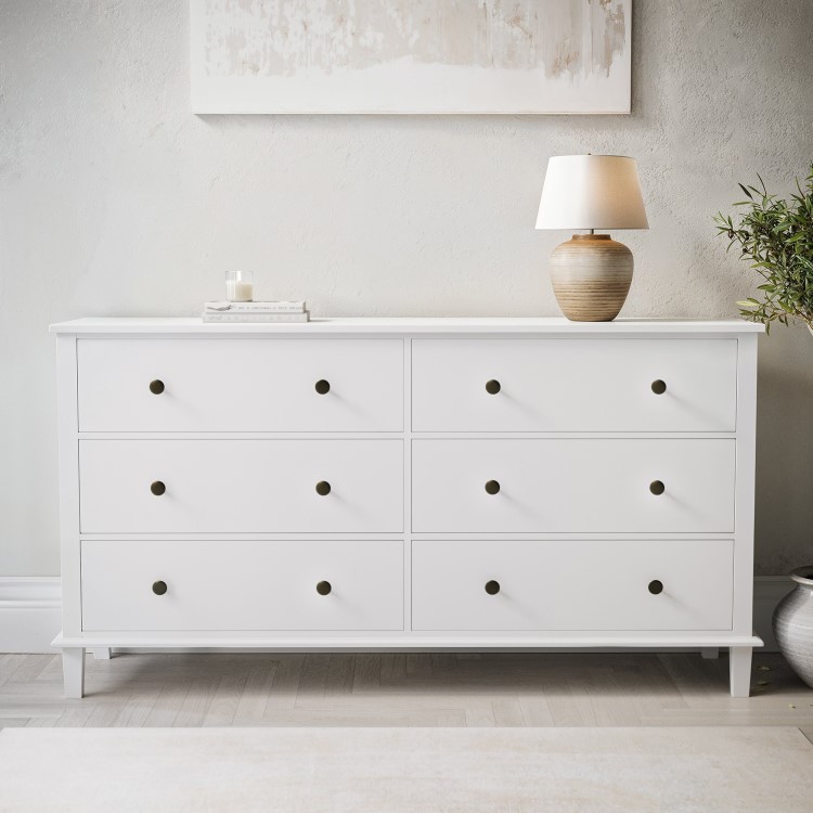 Bring effortless style and practical storage to your bedroom with the Marlowe chest of drawers. The fresh white matt finish, accented by the antique brass handles, gives Marlowe a timeless Scandi look that complements a variety of interior styles. 6 large drawers, with metal runners for smooth opening, offer plenty of space for your clothes and bedding, creating a clutter-free and organised space. Whether upgrading your bedroom storage or refreshing a spare room, Marlowe’s clean lines and classic look make it a versatile choice for any interior.