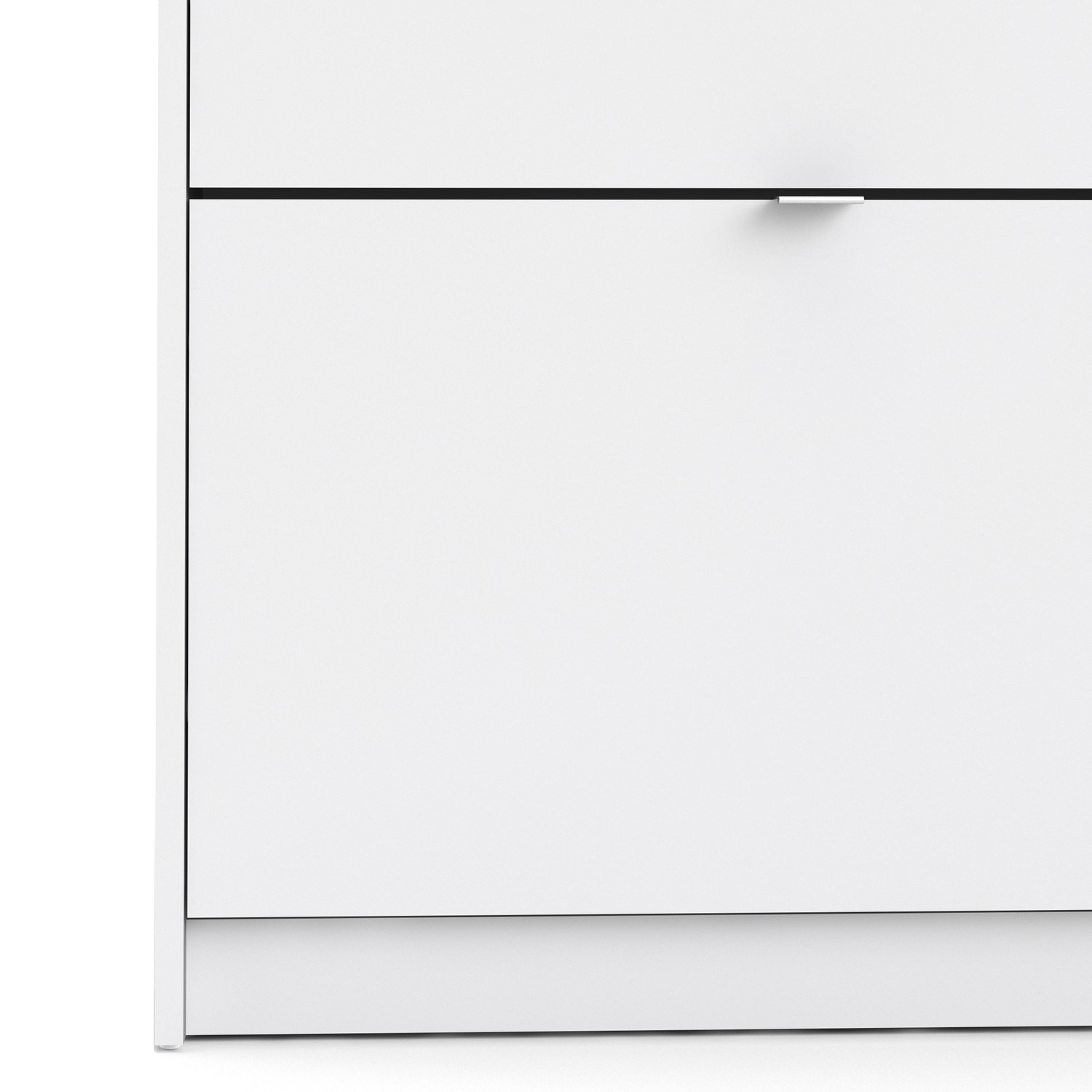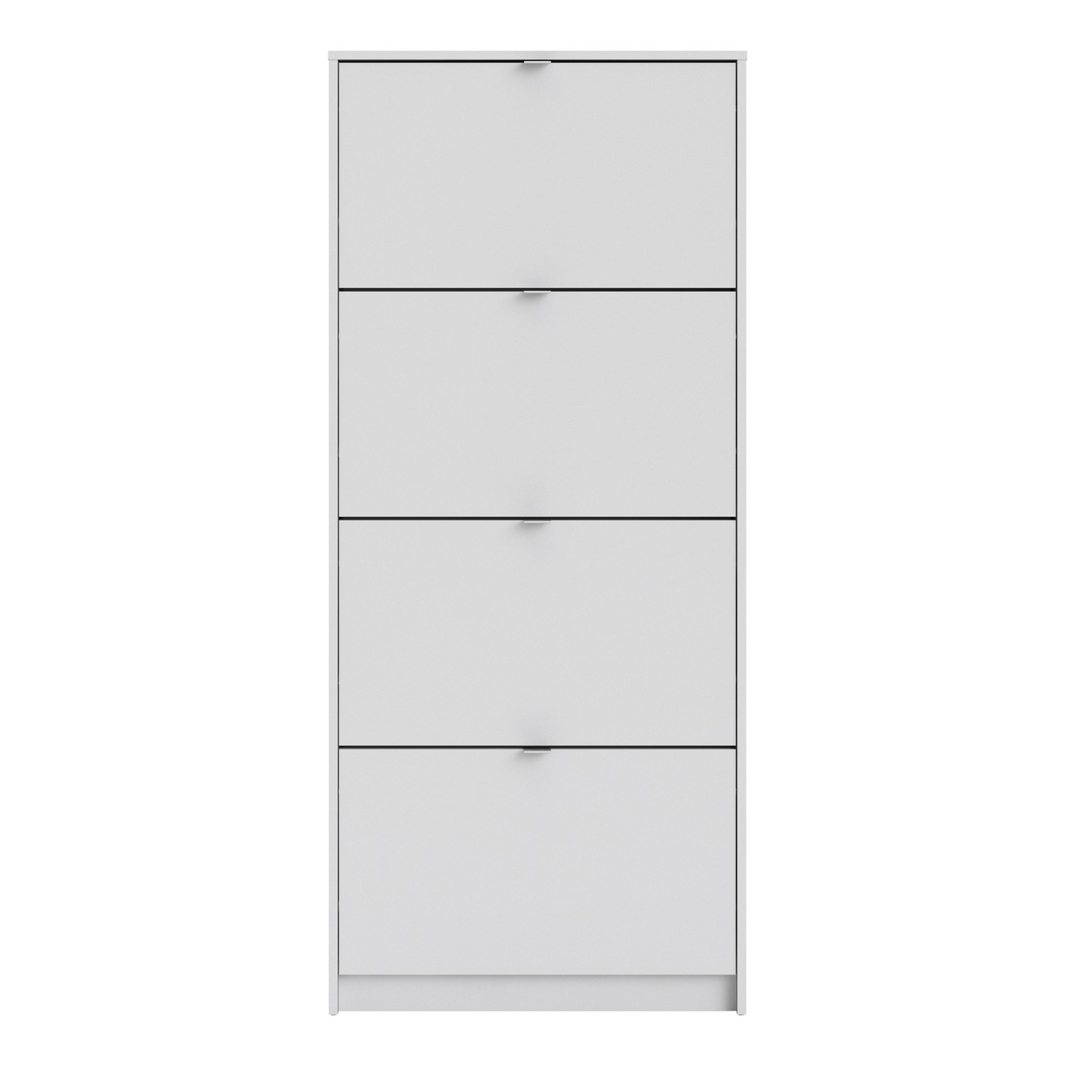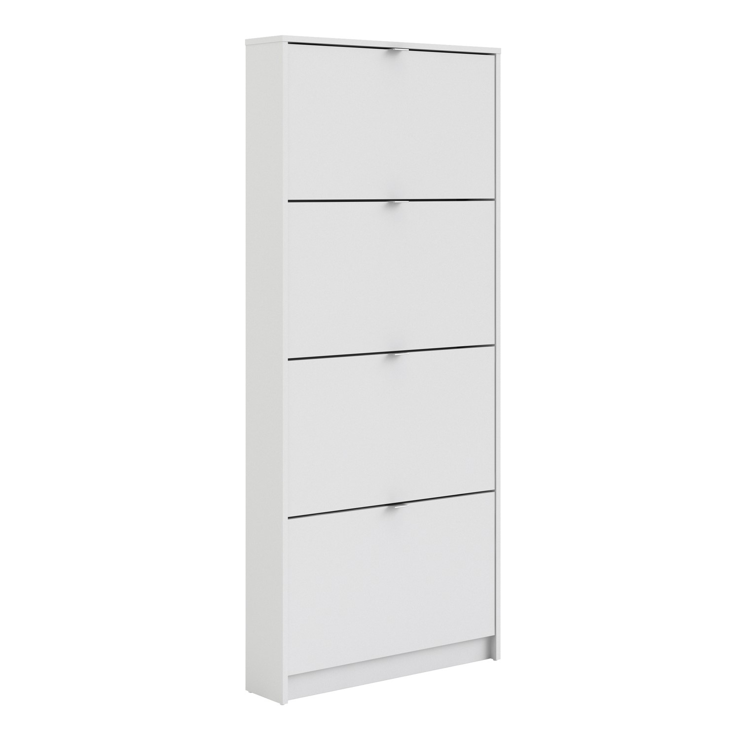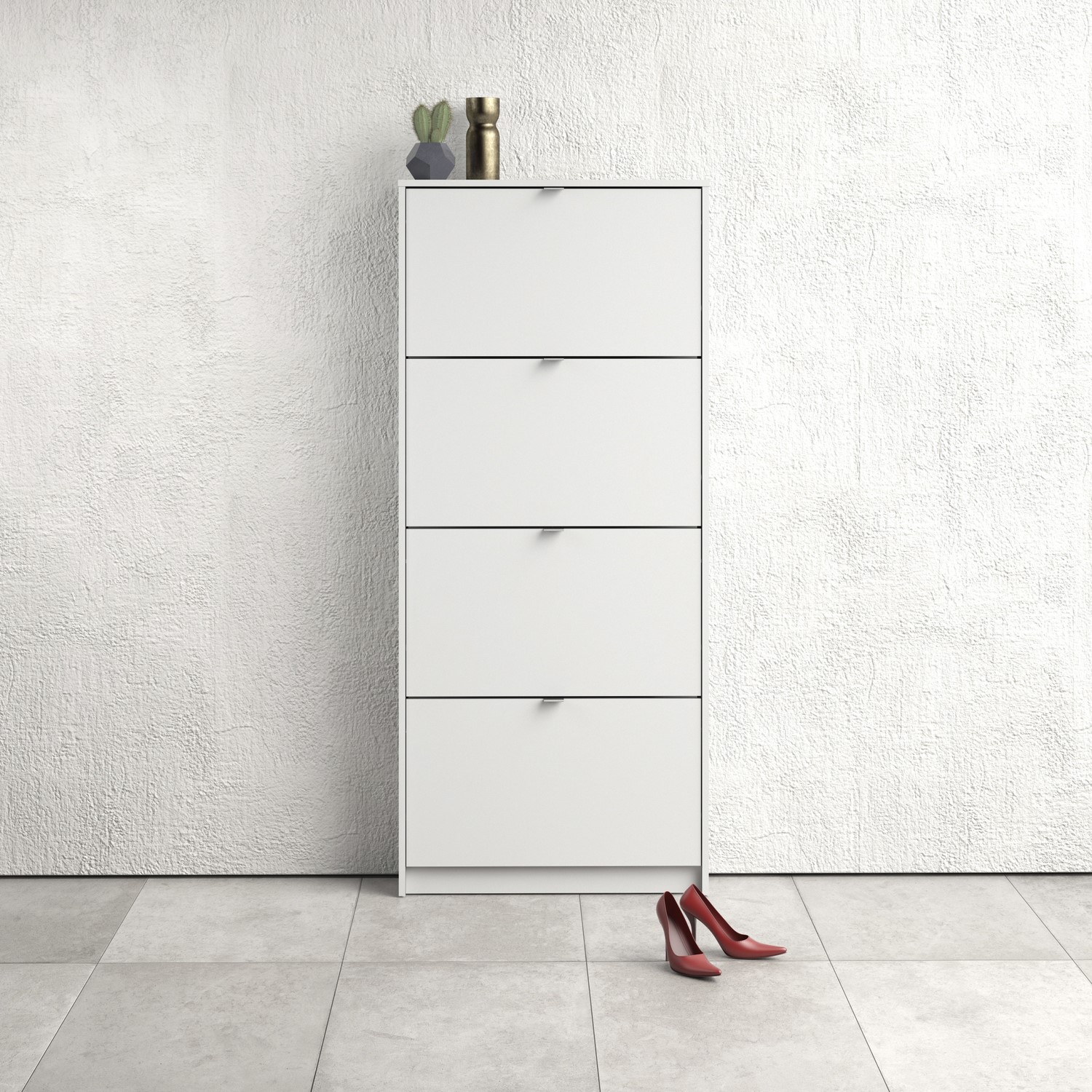 This tall, slim shoe cabinet makes the ideal decluttering solution for your hallway or bedroom. Four easy-open flip-down compartments with subtle metal handles give you quick and easy access to up to 12 pairs of shoes. Plus, it's easy to maintain, thanks to its smooth laminate finish.