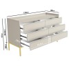Enhance your bedroom with the perfectly on-trend taupe wide chest of drawers. The warm grey finish pairs perfectly with the gold legs for a contemporary look. Complete the look with the matching items or check out the other colours, just search 'Zion'.