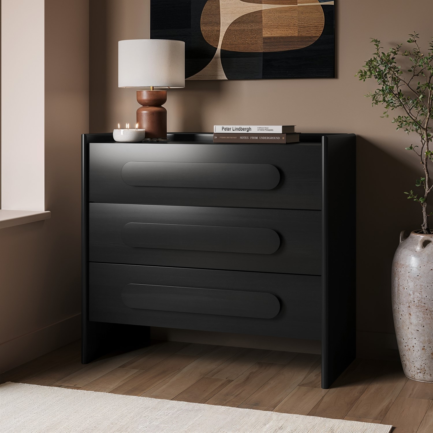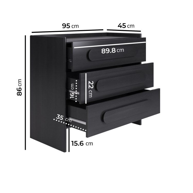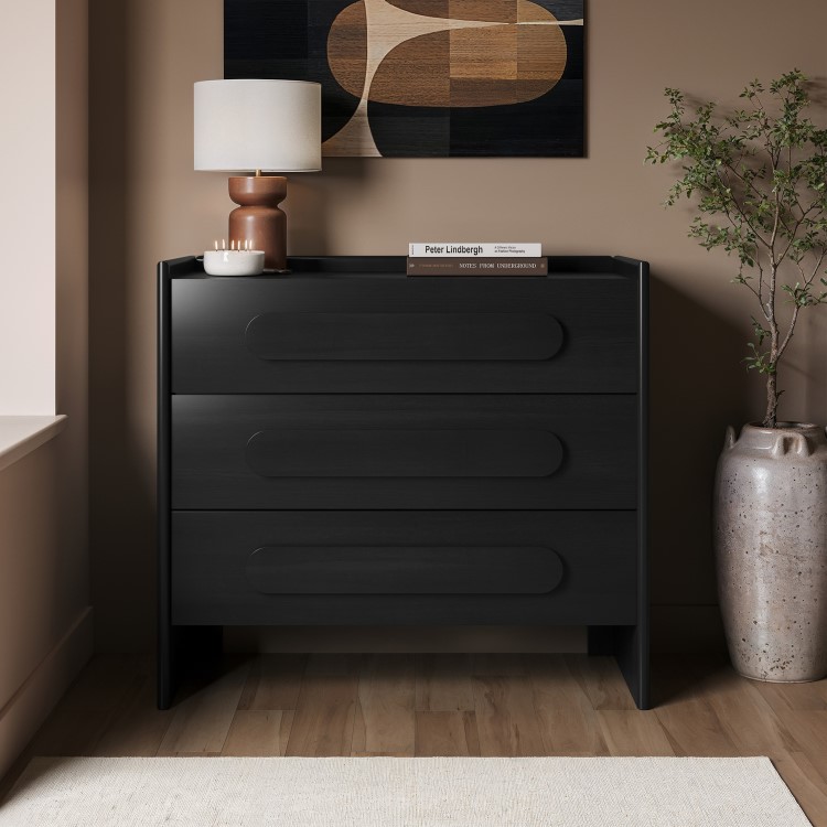 The Margot Wide Black Chest of 3 Drawers combines modern minimalism with practical bedroom storage. Its sleek black finish adds sophistication and texture, making it a standout piece that still blends easily with any décor. Designed with smooth metal runners, each of the three drawers opens effortlessly, offering ample space to organise clothing, accessories, and everyday essentials. The raised edges on the top surface help keep items secure, while the rounded recessed handles maintain a clean, streamlined look. Stylish, functional, and built for daily use, the Margot chest brings both elegance and organisation to your bedroom.