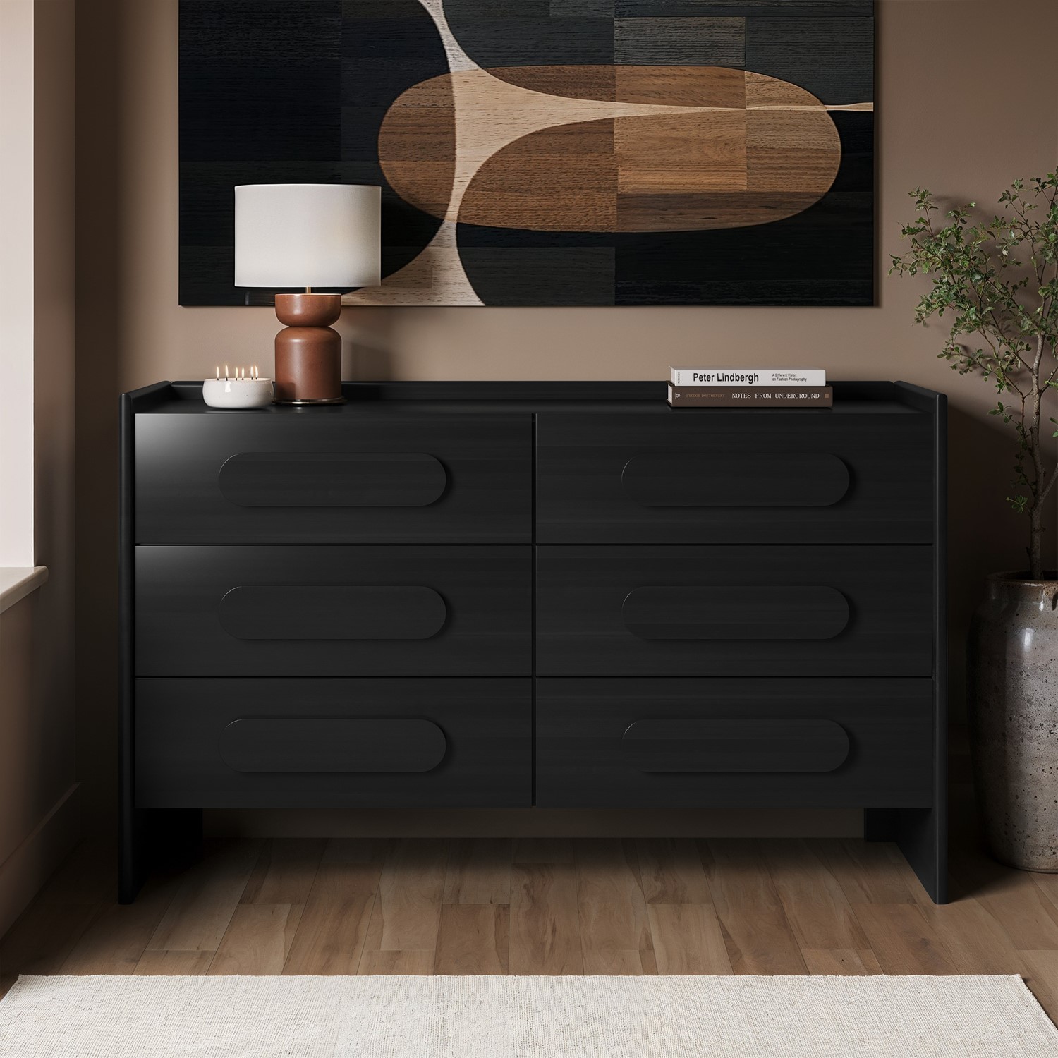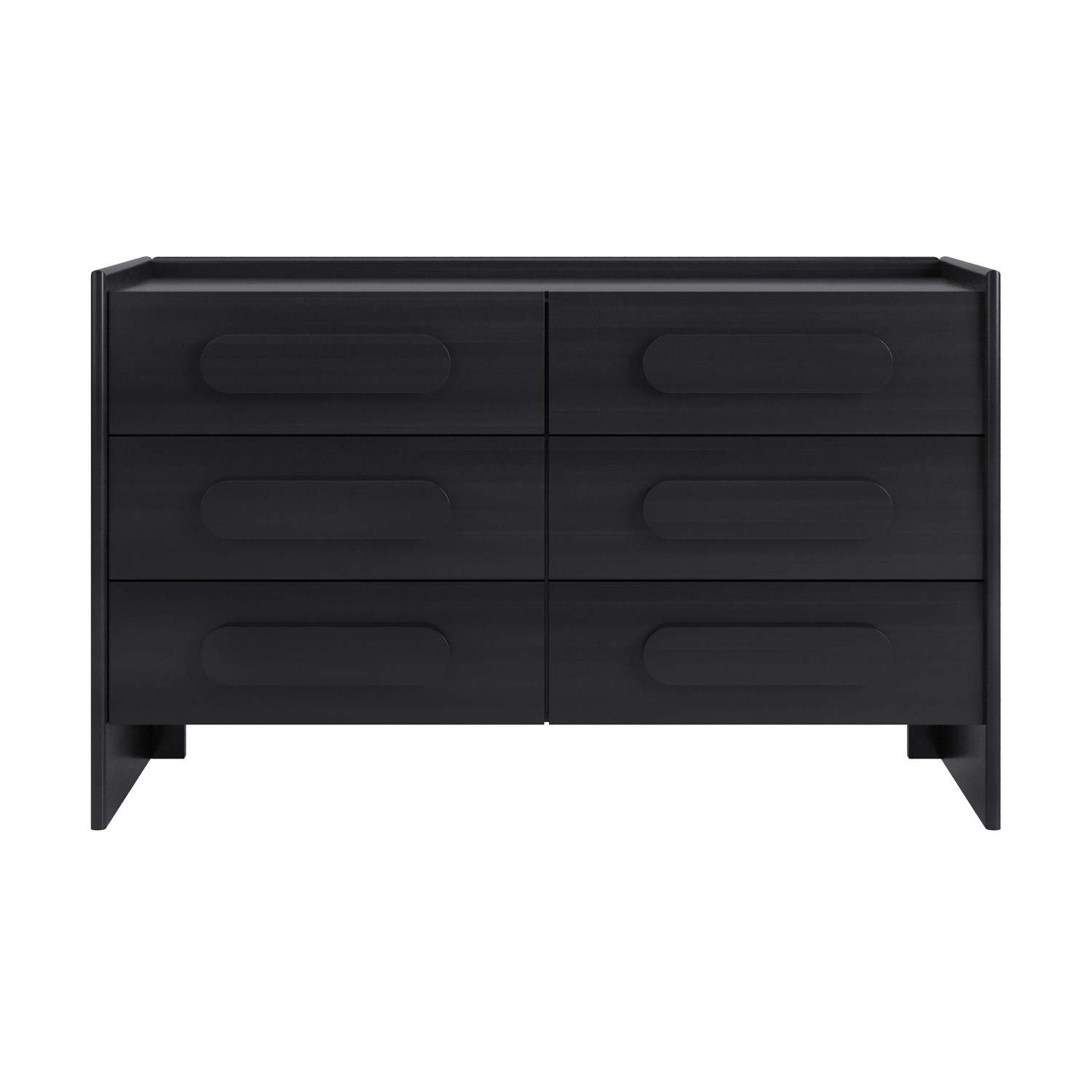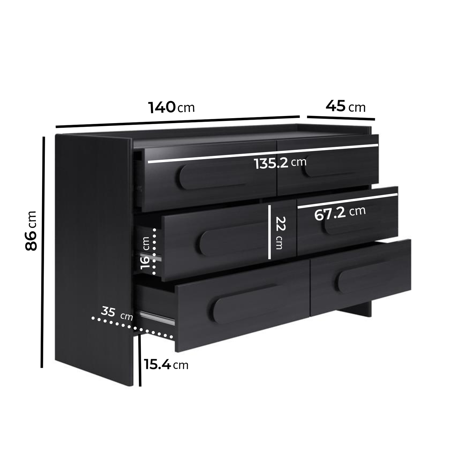 The Margot Wide Black Chest of 6 Drawers combines modern minimalism with practical bedroom storage. Its sleek black finish adds sophistication and texture, making it a standout piece that still blends easily with any décor. Designed with smooth metal runners, each of the six drawers opens and closes effortlessly, offering ample space to organise clothing, accessories, and everyday essentials. The raised edges on the top surface help keep items secure, while the rounded recessed handles maintain a clean, streamlined look. Stylish, functional, and built for daily use, the Margot chest brings both elegance and organisation to your bedroom.