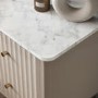 A stunning solution to keep your clothes tucked away, this 6-drawer double chest looks fantastic in any bedroom. It features a spacious, marble-effect top which is ideal for displaying photos or standing ornaments. The taupe grey finish complements any colour that features in your room, while the fluted drawer front design creates more glamorous look. Lifted off the floor by brushed metal legs in a bronze colour, keeping your space light and airy.