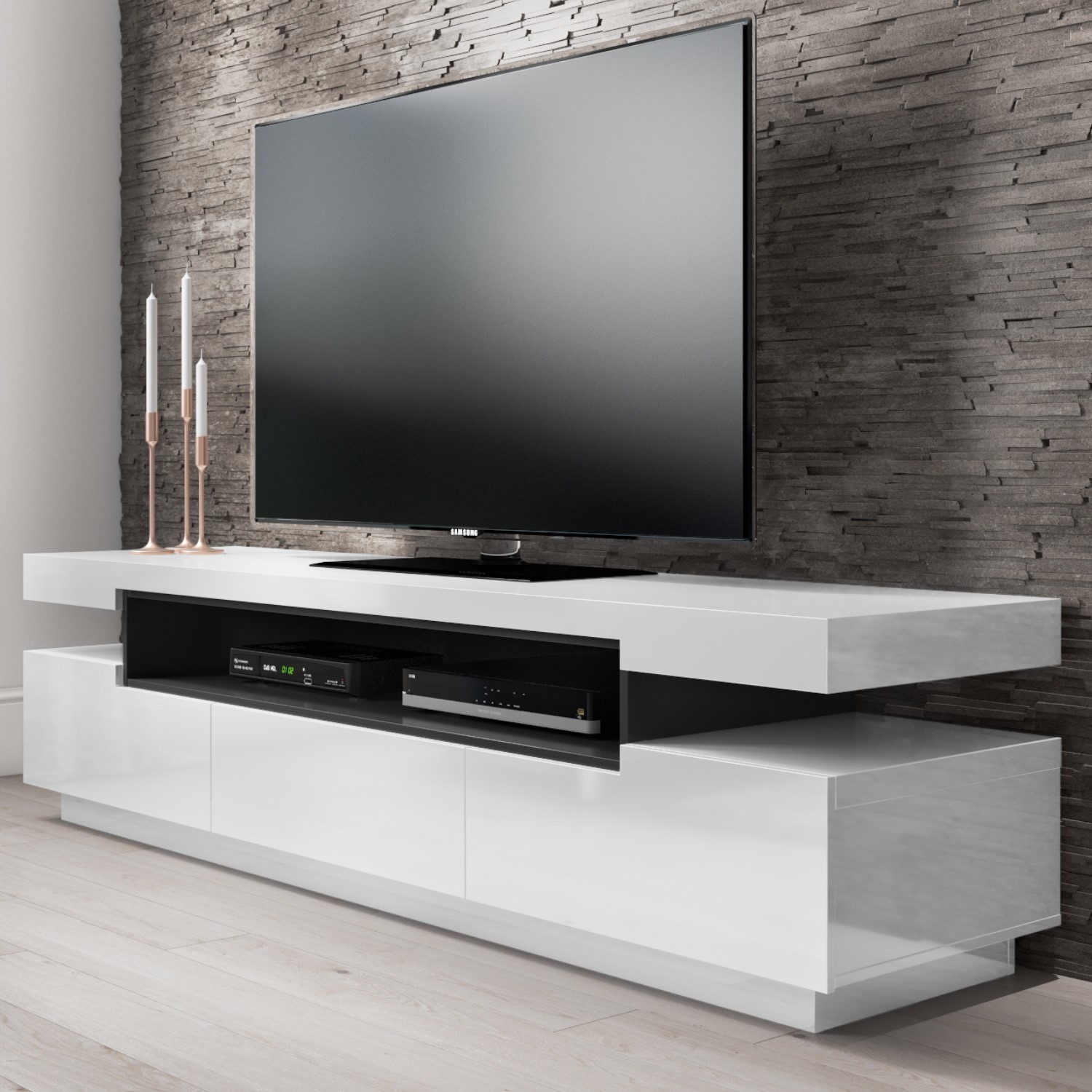 Add a fresh new look to your living space with this super sleek Harlow TV unit. The geometric inspired design is right on trend and it's sure to make a bold impression. Finished in sleek white high gloss, the contemporary design has a flawless finish that reflects light beautifully, helping to enhance the look of light and space within your room.