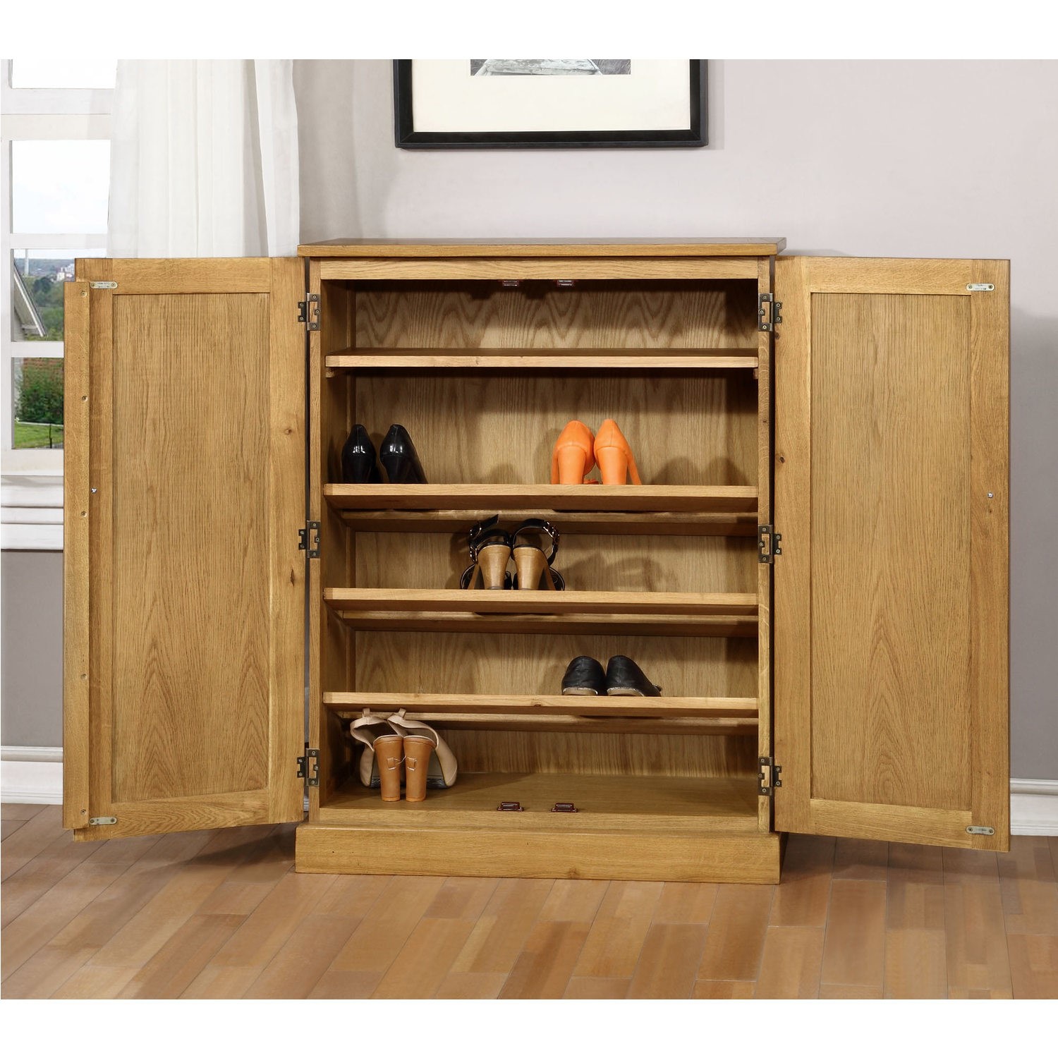 Crafted from solid oak with a warm natural oak veneer finish this Windsor shoe cabinet exudes quality and durability. This shoe cabinet is highly versatile, coordinating beautifully with both contemporary and traditional decors.